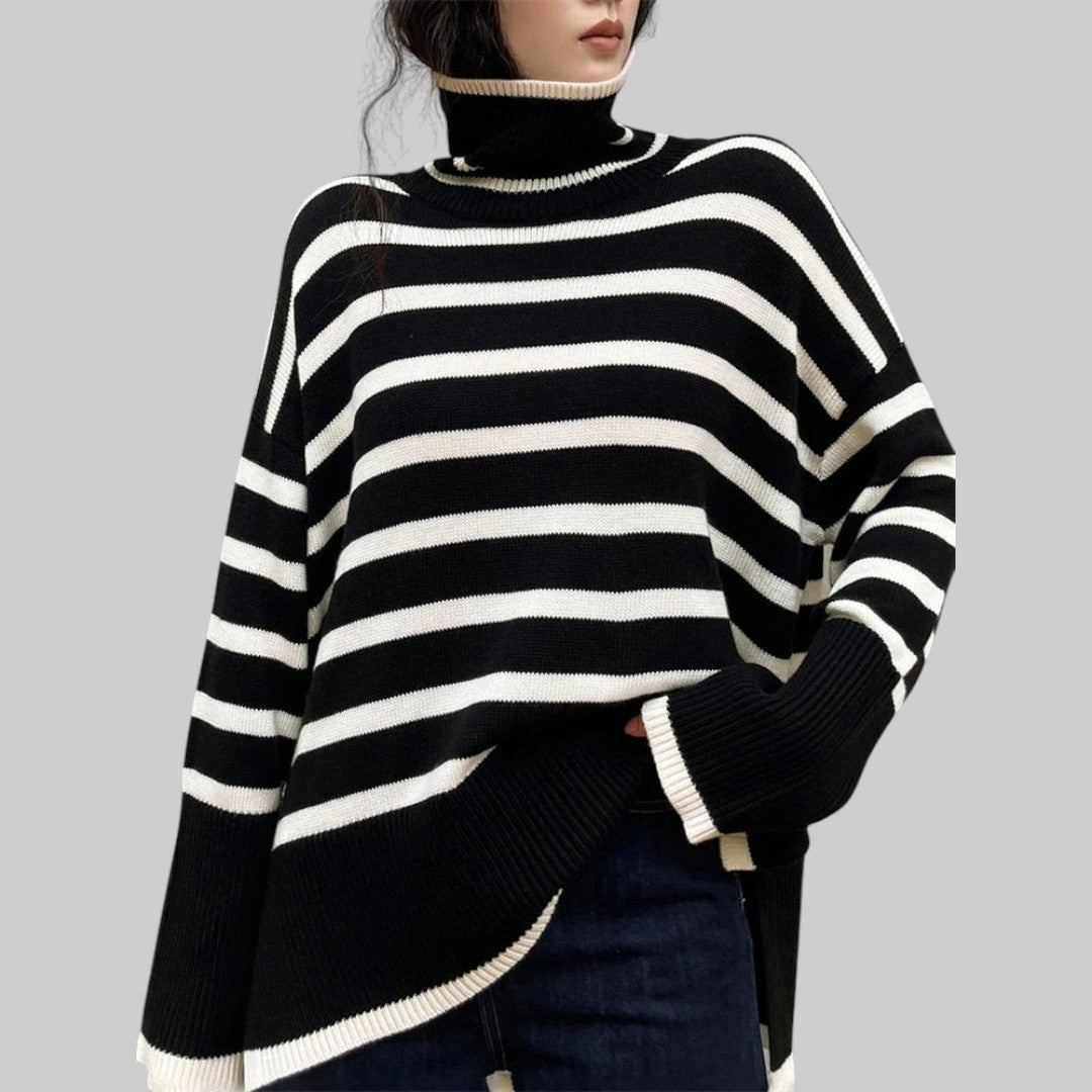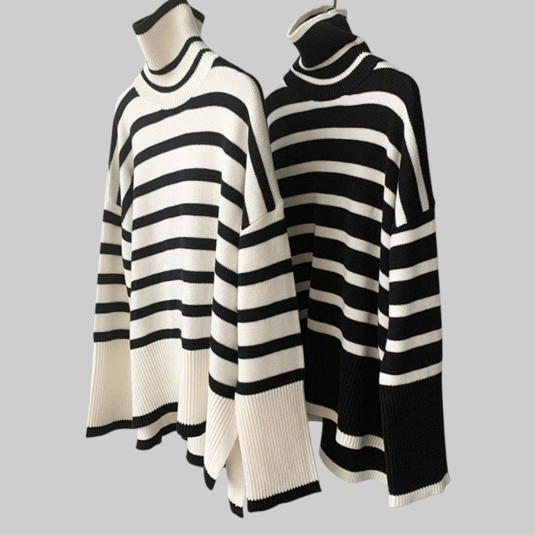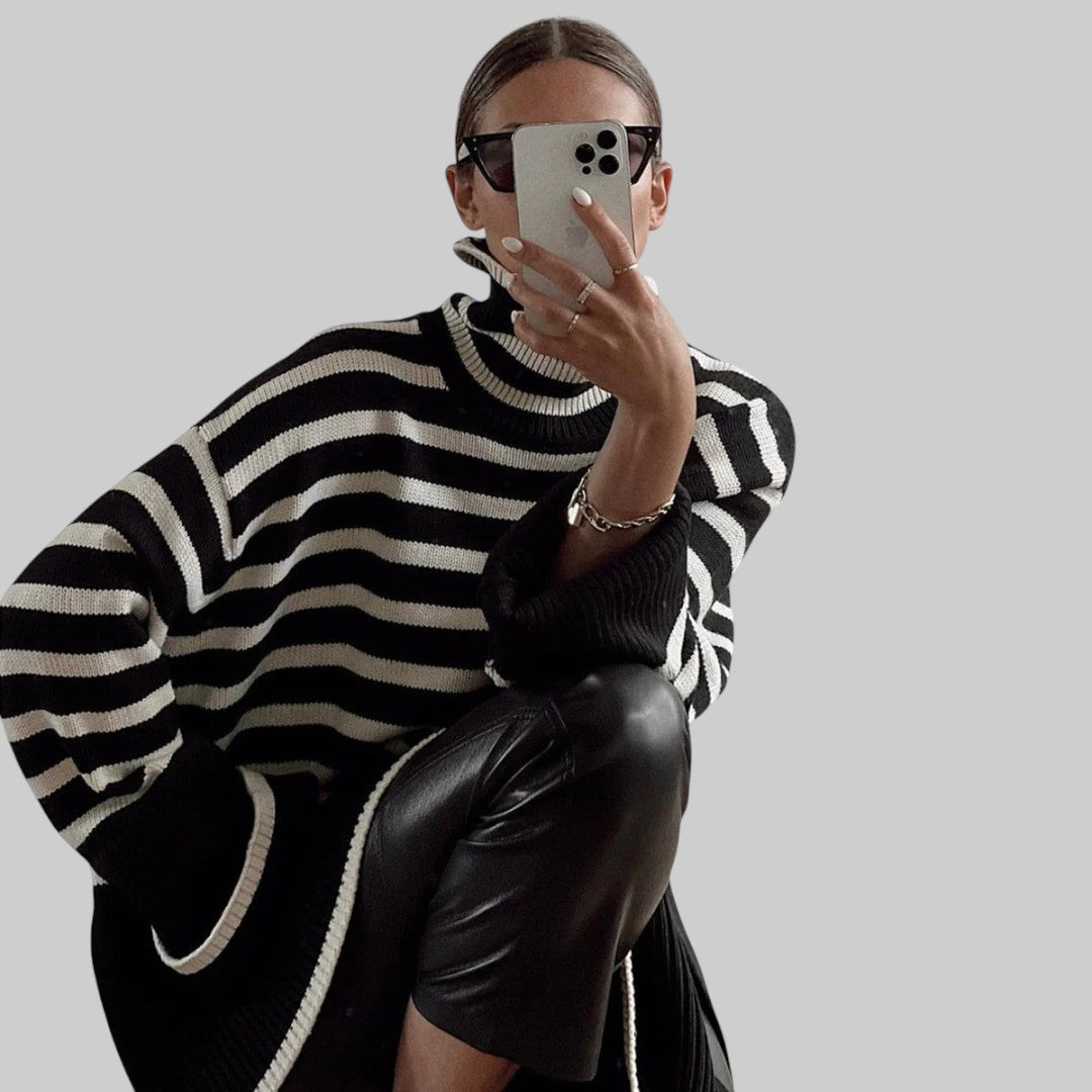 ✓ Ненатрапчива модерна елегантност: Oversize пуловерът с райета и поло яка Беатрис съчетава вечна елегантност с модерен привкус. Ярките черно-бели райета създават чист, минималистичен вид, който се комбинира чудесно с дънки, кожени панталони или поли – идеален за всякакви поводи.