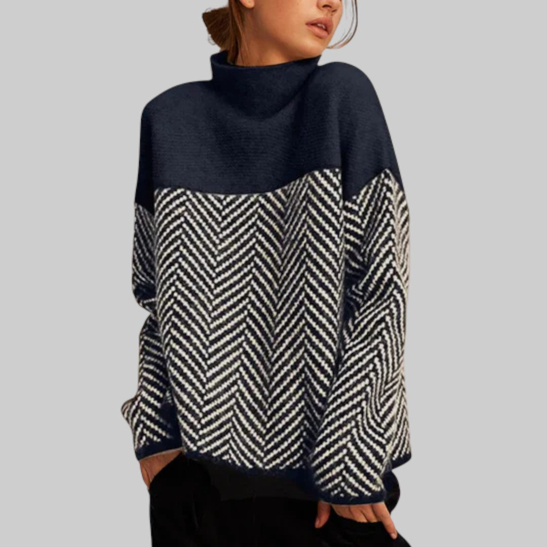 Изискана комбинация от модерен дизайн и удобна елегантност. Пуловерът с висока яка Людмила се отличава с елегантен двуцветен мотив и тънка плетка, която създава перфектен баланс между топлина и стил. Идеален за наслагване или като акцентен артикул, той носи внимателно обмислен комфорт в гардероба ви.